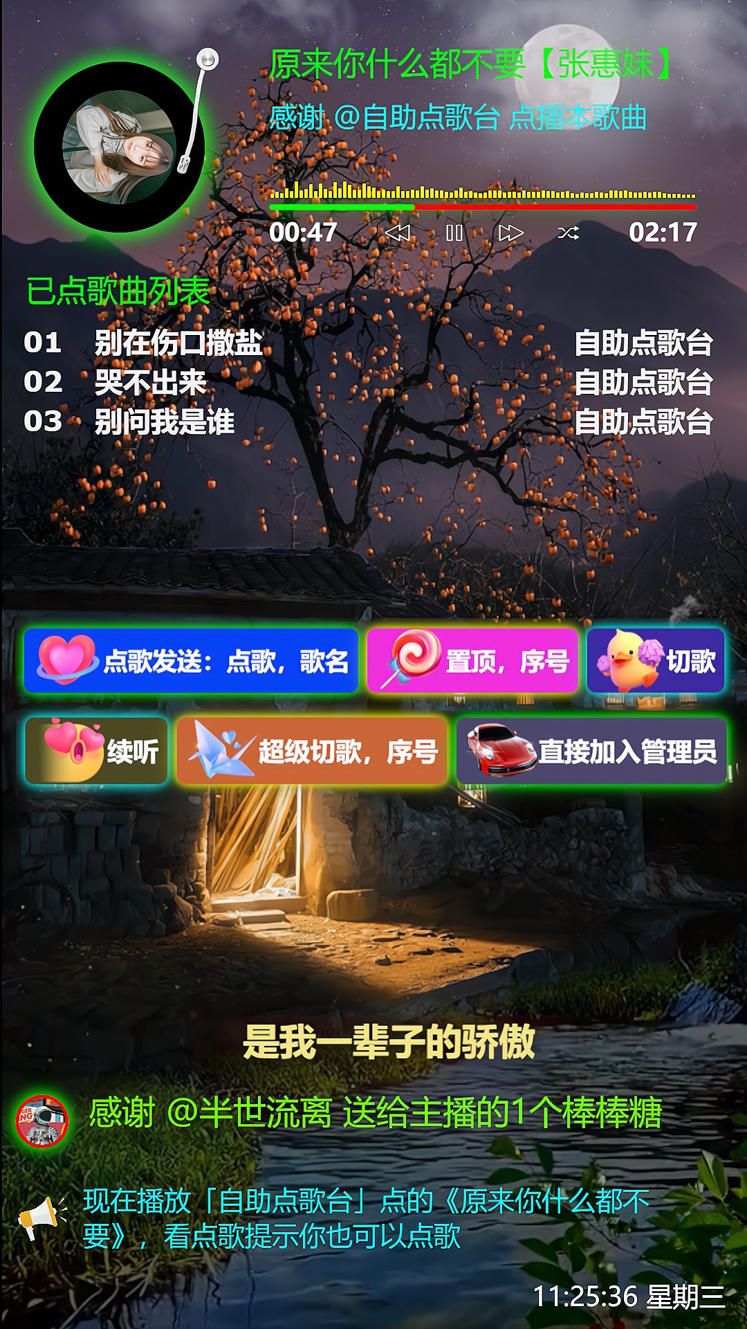 自助点歌台出新插件了,支持刷任何礼物召唤火箭、嘉年华、天空之城、宇宙之星等绝版唯美特效、支持木鱼计数、爱心计数、心动计数、支持音播特效、支持头像用户名飘屏、支持刷礼物落座贵宾席,特效美到让人窒息,美到...